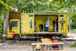 Während des Sommers bilden die Möbelwerkstätten eine pulsierende, multifunktionale Kommunikationsplattform für Wissensaustausch und Gemeinschaft, die Begegnungen mit Jugend- und Rom*nja-Kultur ermöglichen.